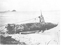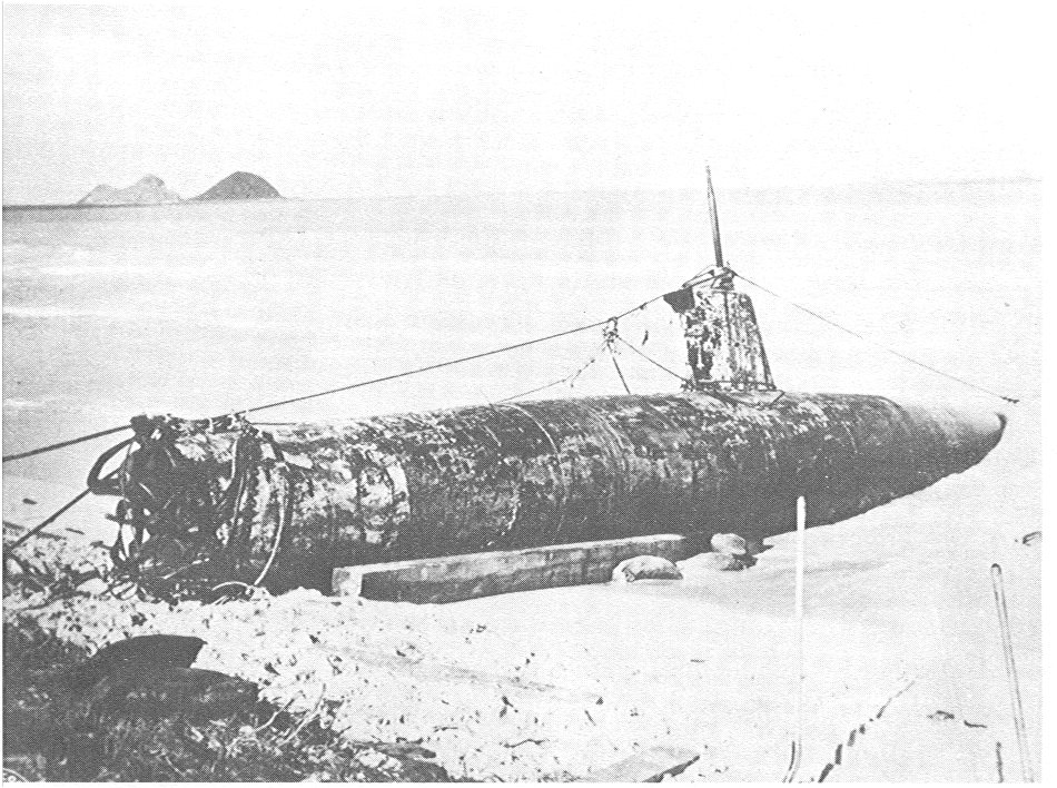 Closeup view of the Japanese midget sub which was dragged to shore by a huge bulldozer at Bellows. Among the articles found in the sub were dried fish, apples, canned goods, American pencils, and one bottle labeled "Wilkens family ."