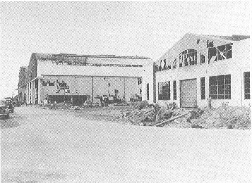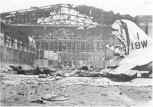 Above, Hangar I, devastated by the Japanese attack, with block dividing wall visible on left. This saved many of the base engineering shops from destruction.