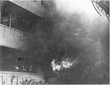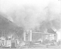 Above, the roar of flames in Hangar 3 was punctuated by firecracker-Iike explosions from the great quantity of ammunition stored there; and below is another view of blazing fires in the twisted remains of Hangar 3 at Wheeler Field. (Joe K. Harding)