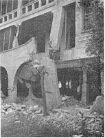 Russell J. Tener (left) and his friend Bill Enos (far right), while on guard duty at this PX warehouse, escaped harm when the building was shattered from the concussion of a bomb which left a crater (partly visible in left foreground) about 20 feet in diameter