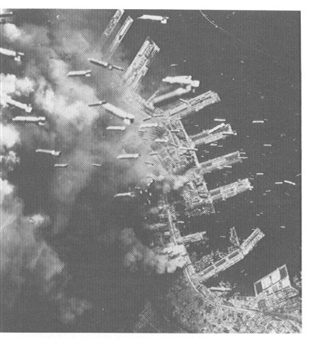 Incendiary bombs shower on the dock area of Kobe, Japan, on June 5, 1945