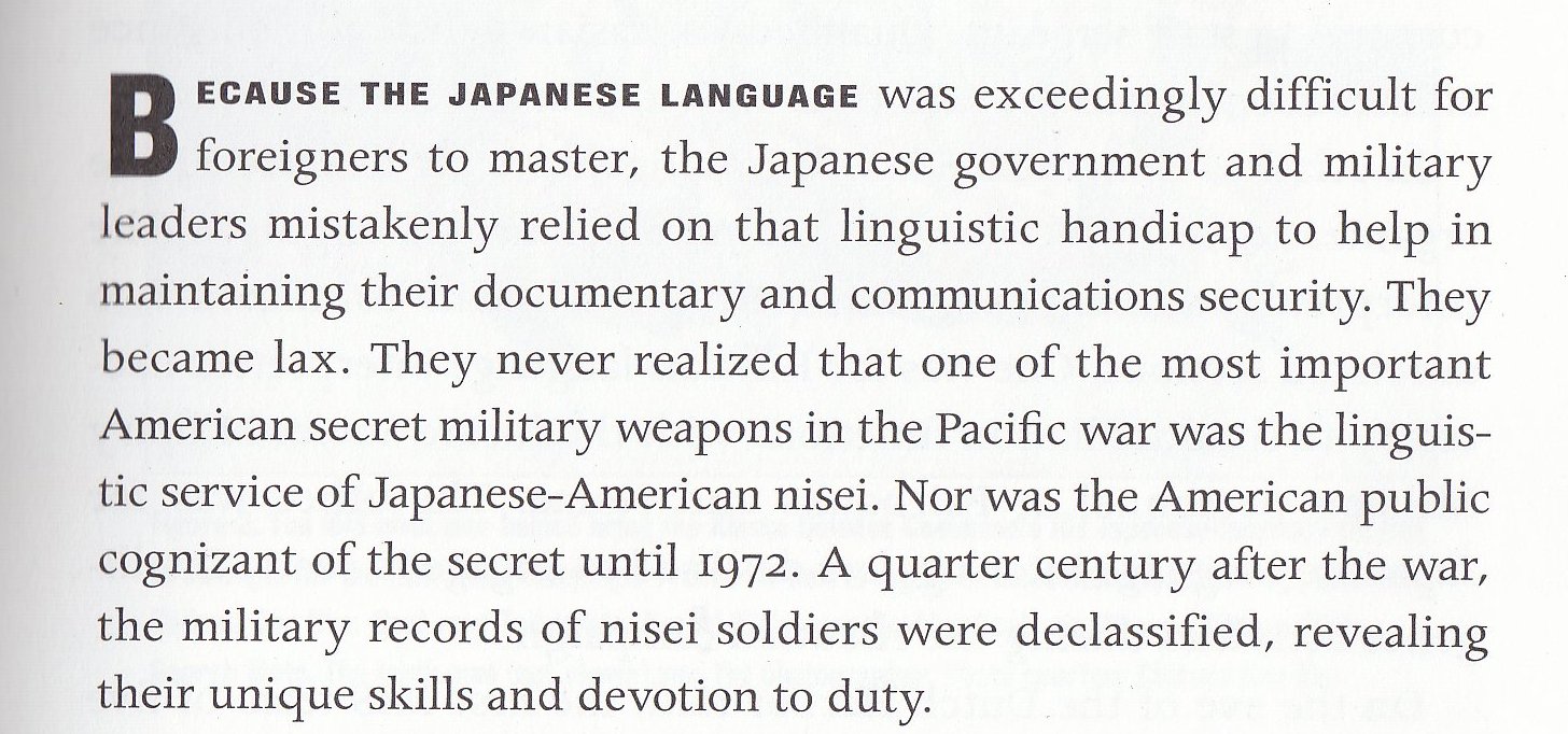 Nisei were used as translators, even though their own families were often ones still in the internment camps. The Japanese, the author notes, had not figured on the U.S. having or using the Nisei as translators, and that was a mistake on their part. The Japanese also were unable to stop their troops from keeping diaries, and, from time to time, these were found, usually on the bodies of dead Japanese soldiers, and some proved useful to the U.S. military.