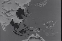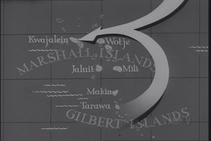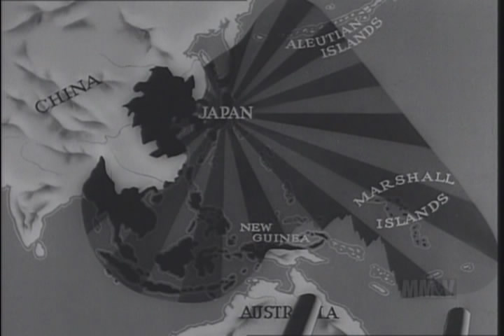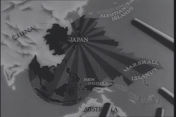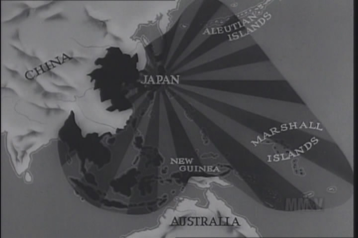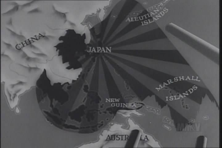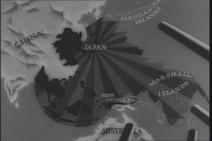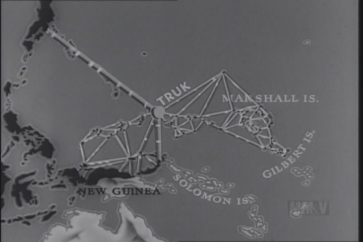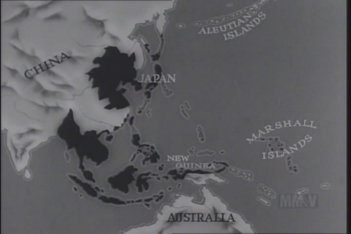 The video opens by showing the extent of Japanese control in the Pacific, and how they were forced back from one area after another.