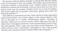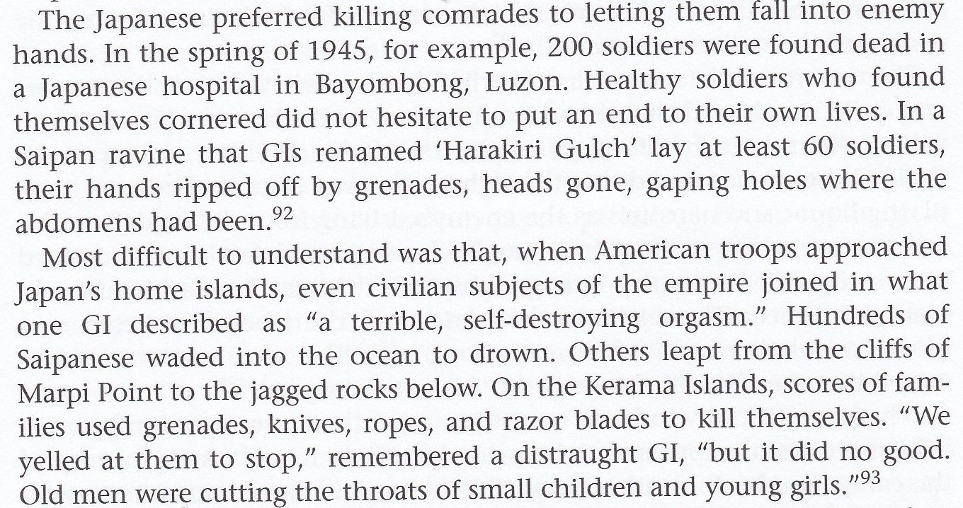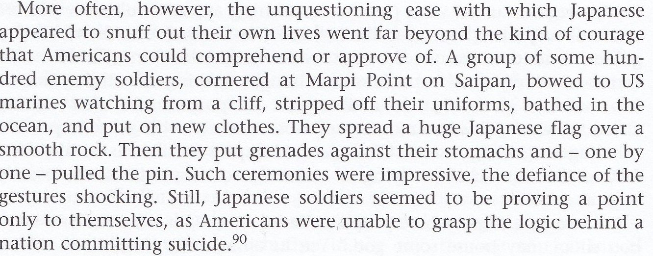 This was also shown by the way that wounded Japanese soldiers would kill themselves, and by the way that even civilians chose suicide over surrender (although a good part of this was due to Japanese propaganda that led the civilians to believe that American soldiers would rape them and brutalize them.)
