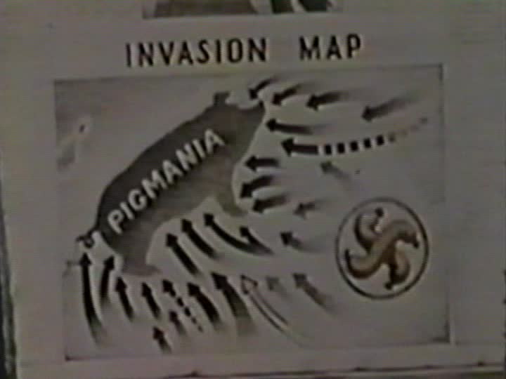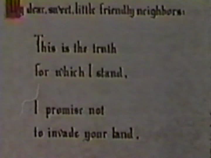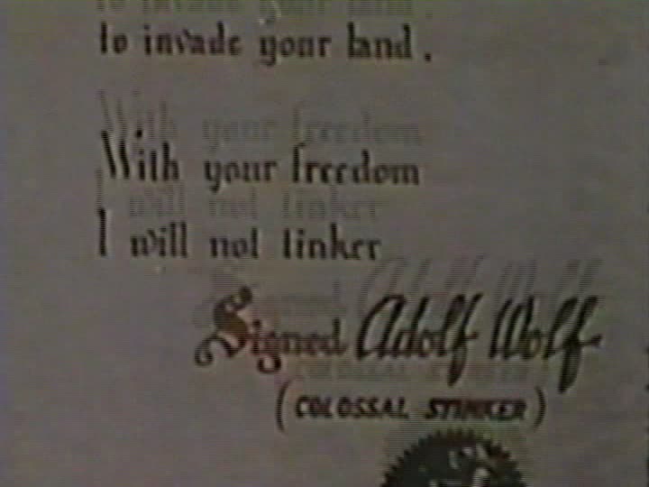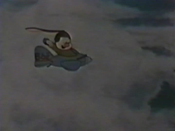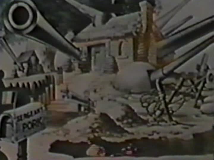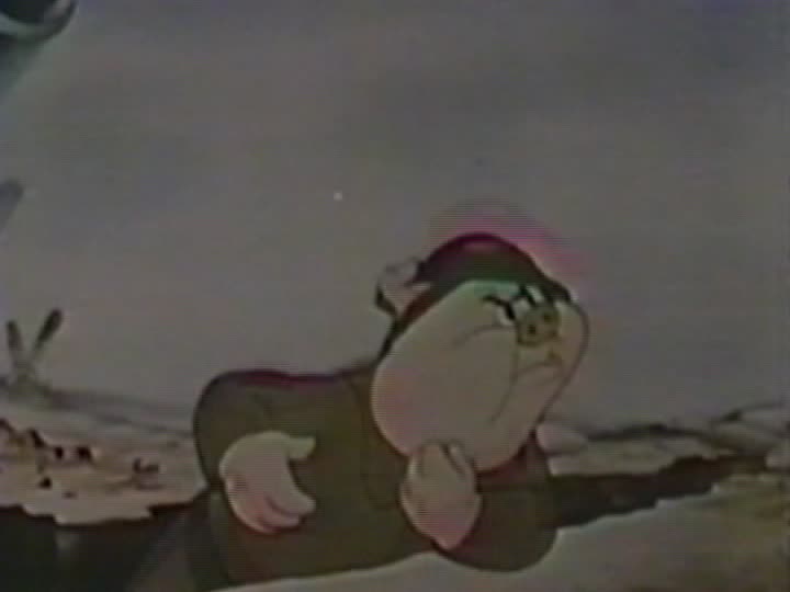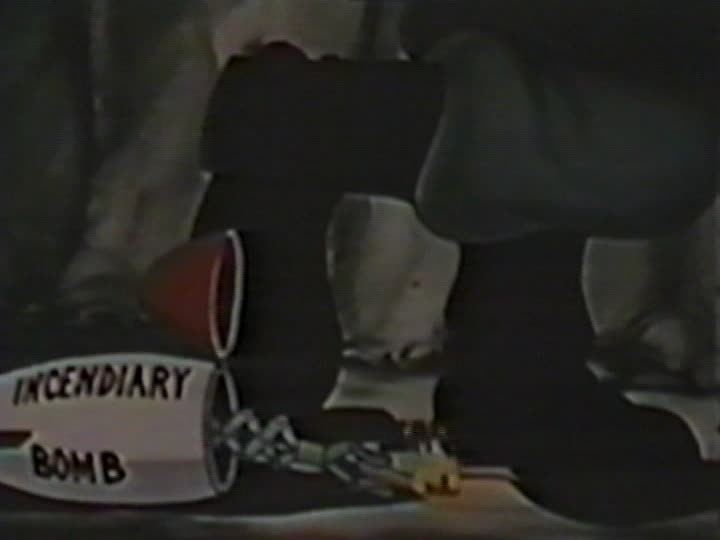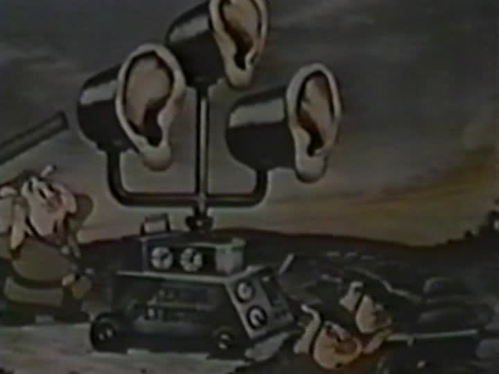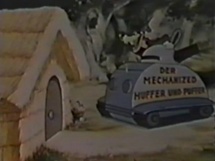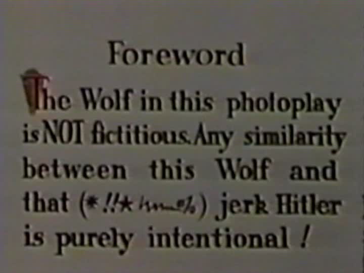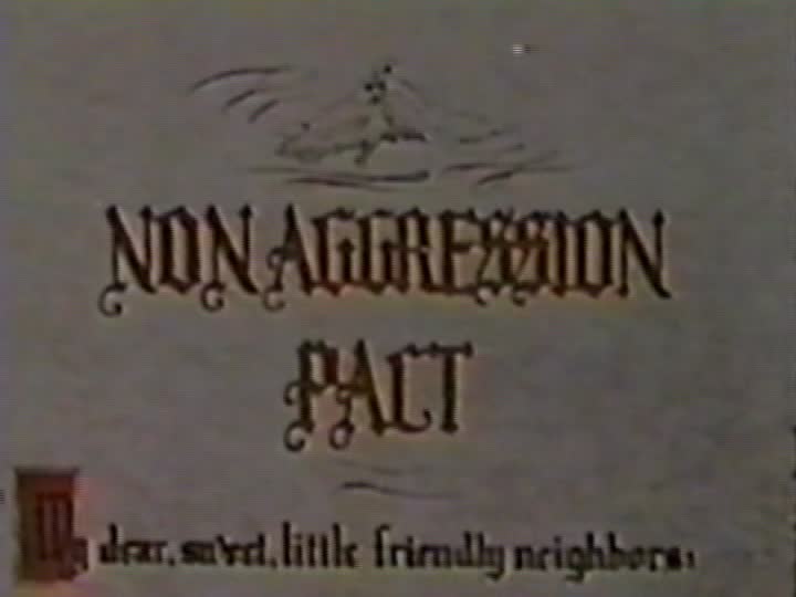 This starts with a take off on the Three Little Pigs story, with one pig building his house of straw, one of sticks, and the third builds a fortress. Two of the pigs have signed a non-aggression pact which the wise pig tells them is useless. Of course the wolf, aka Adolph Hitler, attacks.