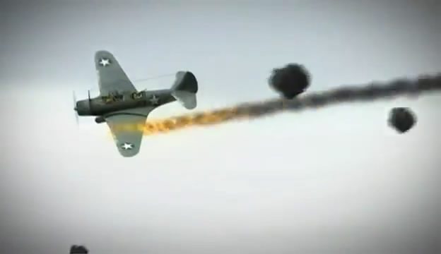 American torpedo bombers, slow planes, are attacked by Japanese Zeroes and are shot down.