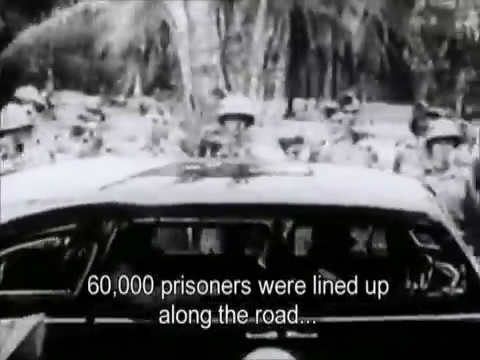 Opening scenes show the emaciated POWs of the Japanese then goes to one of the men who survived. He says the Japanese behavior was barbaric.