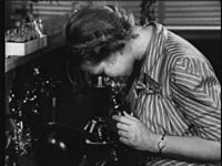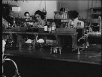 The film talks about how silk is needed for parachutes, and how substitutes are being made and tested in the laboratories.