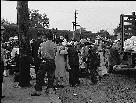 Farm family of Japanese ancestry see the train approaching down the track, which will take them to Merced Assembly Center. They hasten to gather to their respective places as instructed. 5/20/42 |