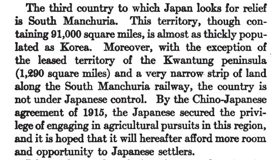 Japan's interest in Manchuria. The author then goes to talk about Japan's need for raw materials that the islands have.