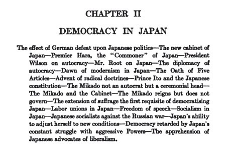 The contents of chapter 2. This section goes into a little bit of Japan's history. He then goes into a description of the Emperor's non-involvement with the actual running of the country. He's trying to say that Japan is developing into a democracy with the rest of the chapter.