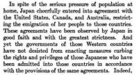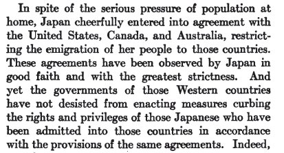This is referring to the anti-Japanese prejudice on the U.S. West Coast at the time, and the move towards alien land laws and strict limits on immigration. The author is also saying that the Western nations have double standards, and do not judge the Japanese nation with the same standards they judge their own nations with.