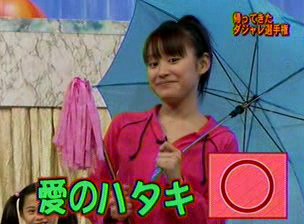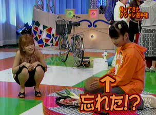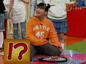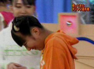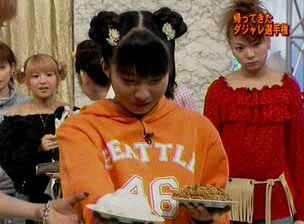 Natsumi Abe starts to put the plate of food behind her and ends up dropping the food on the floor. Nozomi dropped some food a few minutes later.