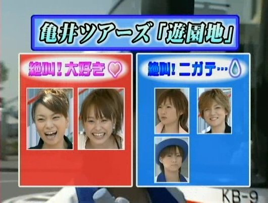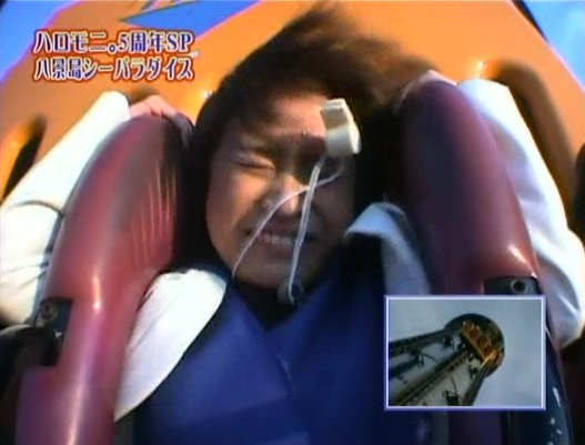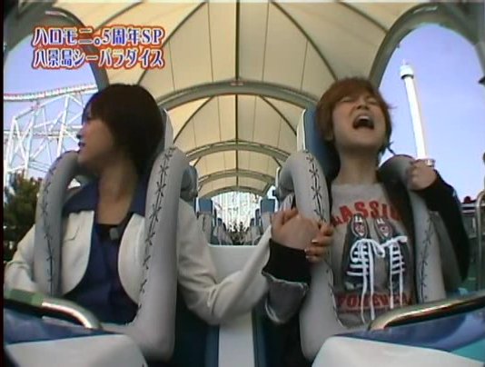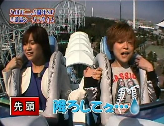 One team goes to an amusement park. They are going to ride on a BIG roller coaster and draw sticks to determine if they will sit in front, in the middle, or at the back. Natsumi Abe got one of the back seats but she still appears terrified.