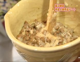 Natto, fermented beans, which has a very distinctive smell and is like by some and strongly disliked by many. The three girls seem to like it.