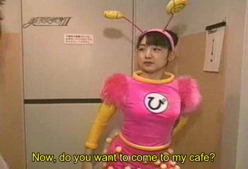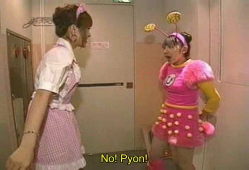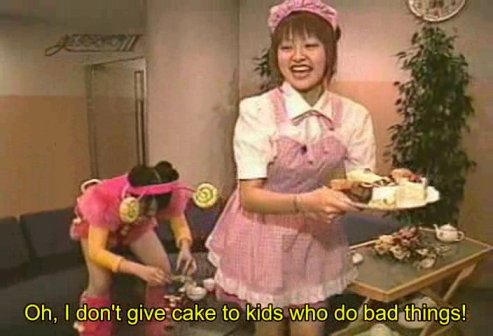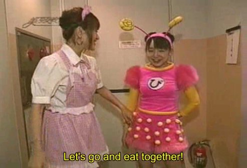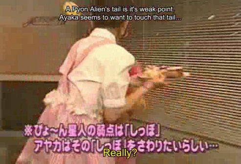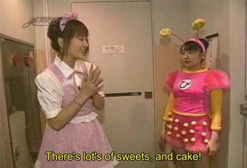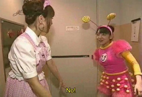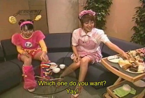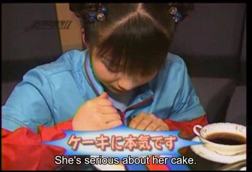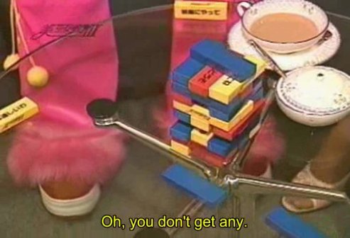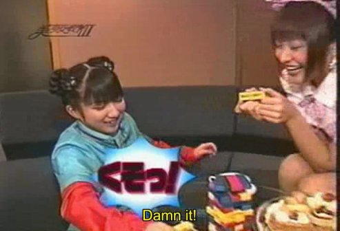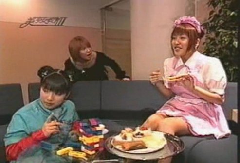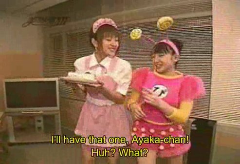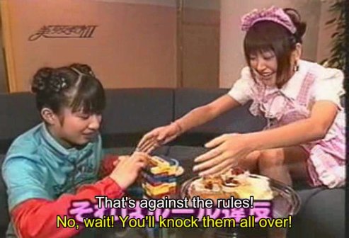4/12. Really/Is that true? (Tsuji Nozomi) Anything with Tsuji is bound to be interesting. At first she doesn't want to go with Ayaka to her "cafe," but when Ayaka shows her the plate of cakes she can choose from Tsuji is more than willing. Once there, after pulling a blue block out (even though she was told she was not to pull any blue ones out), she pulls out another block and later starts to destroy the entire pile!