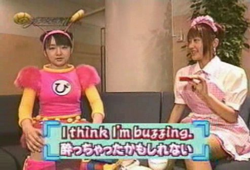4/19. I think I'm buzzing. (Kago Ai). The sentence really should be "I think I'm drunk." Kago proceeds to destroy the pile of blocks, prompting Ayaka to say that now she won't get any cake.
