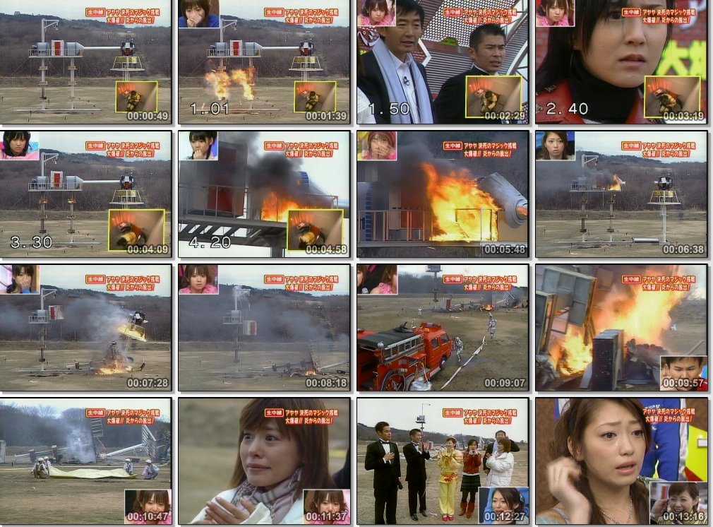 The clip deals with the last 14 minutes of the trick, so I'm not sure what has gone before. Aya has apparently been tied down to a chair, put in a box-like room, the door blocked, and then the room put on a platform. As each minute goes by from the start one set of explosives goes off until three have gone off. Then there is an explosion on the platform and a fire starts; most of the platform collapses, hitting another contruction which also explodes.