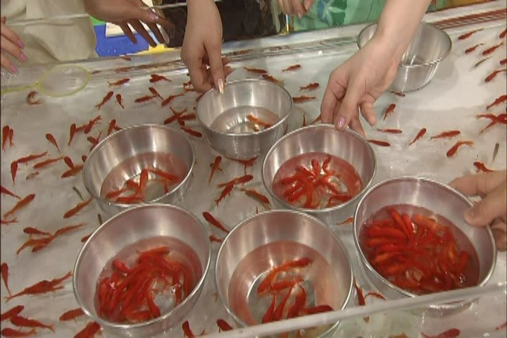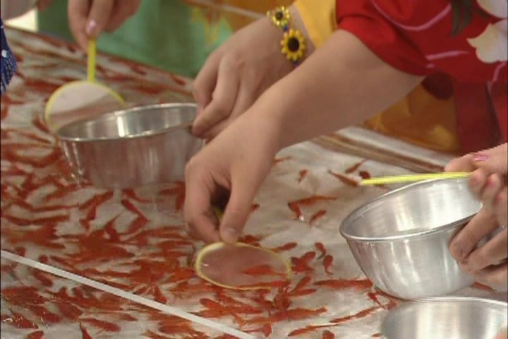 The trick is to catch the goldfish using the paper net. The paper, though, is very thin and very, very easily torn, so it takes a delicate touch to catch the goldfish, lift it and put it into the bowl without tearing the paper.