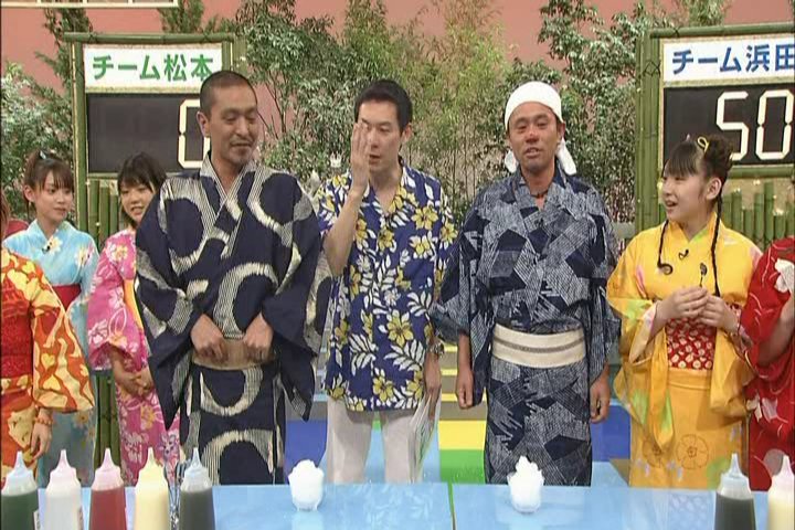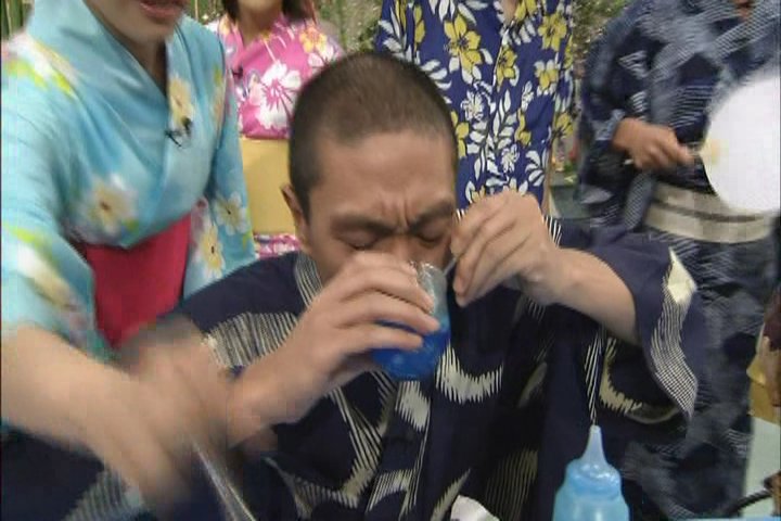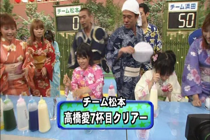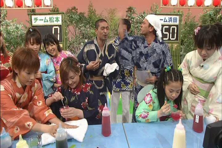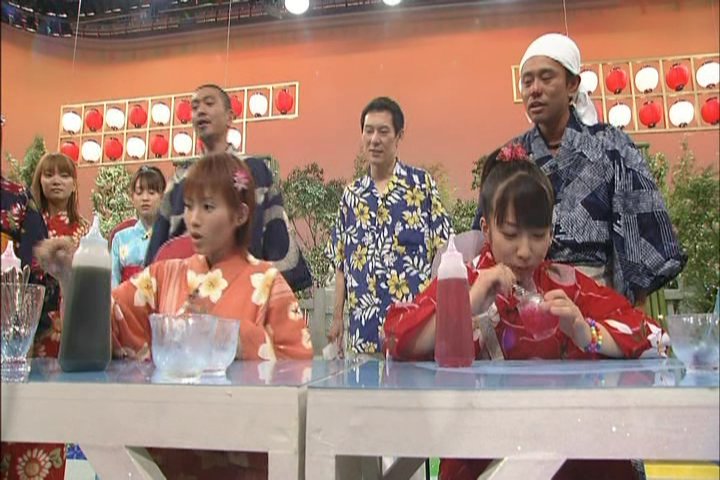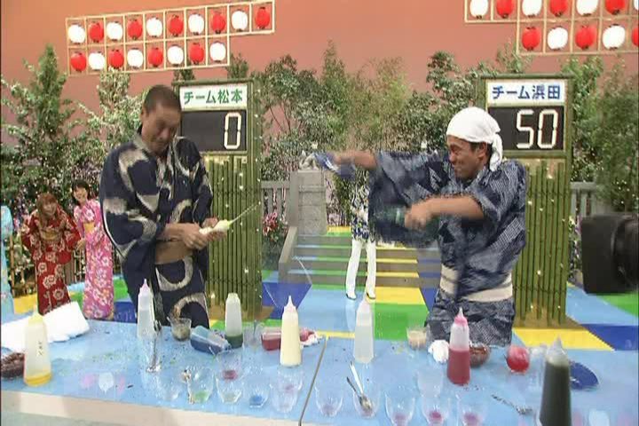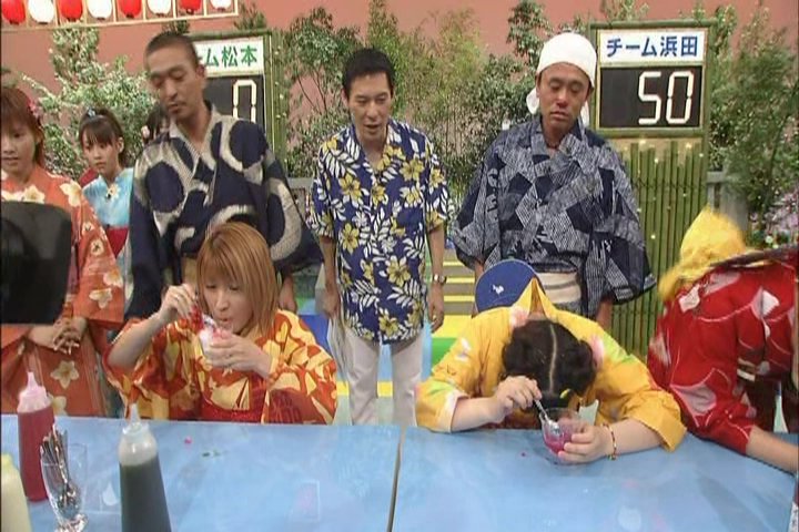 The show host pours so much topping onto his ice that it's more liquid than snow-cone. He then eats another one but not before an accident with one of the containers spills yellow topping all over the table and him. (I think he's fooling around some to give the other team's girls a chance to catch up a little.)