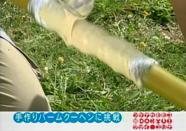 One of the girls is pouring batter over aluminum wrapped around a piece of bamboo, I think.