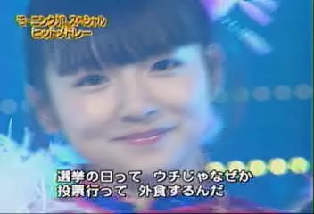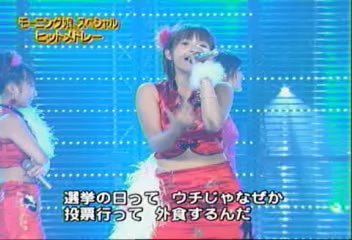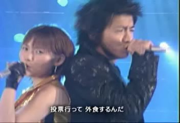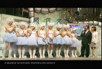 Combining two of the biggest J-Pop groups together produces a rather good result, actually, using several songs for the medley. SMAP and Morning Musume blend together fairly well. One of the cutest parts is when SMAP teams with three members from Mini Moni to do Jan Ken Pyon.