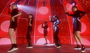 4. Daite Hold on Me ("Hold Me, Hold on Me") : Most of this song is pretty good. The music is good and the visuals are quite interesting. The girls appear in a wide variety of places and outfits, and there is one sequence which looks as if it were from Close Encounters of the Third Kind.