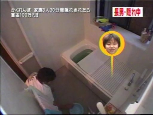 They put the 8-year-old boy in one half of the bathtub and roll the cover over it, leaving the other half exposed. One of the adults hides under a bunk bed.