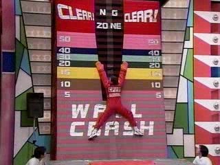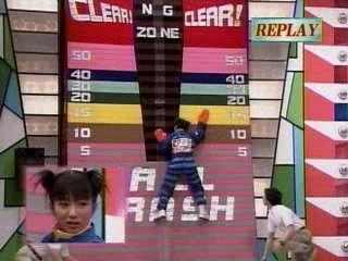 The girls jump off a platform and land on a small trampoline-like thing and then bounce up and try to fasten themselves to the highest place on the wall that they can. For those who see the one TV extreme series (a dubbed Japanese show), there's a rougher version of this same event.