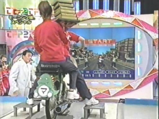 The next test involves two girls on a motorcycle, one driving and one riding holding pizzas. The driver looks at the screen ahead in order to steer. Every time they have an accident on the screen the bike moves and the pizzas fall. They have to get off the bike and pick them up then get on and start again, trying to do this within a set time limit.