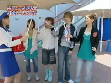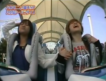 Someone has got a bunch of fake snakes together. Kago Ai acts like she's going to eat one. Apparently someone must have thrown one at Yossie because she takes off as fast as she can. Apparently she doesn't care for snakes any more than she cares for roller-coasters.