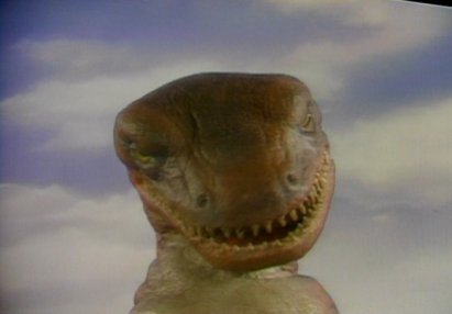 A T-Rex pursues another dinosaur. It is interesting to note here that there's some argument among scientists about whether or not T-Rex was actually a hunter or a scavenger. Some scientists believe that his two very small front limbs limited him to the role of a scavenger, yet others still think he actively hunted his prey. This one they have named Grumpy. (Which causes a person to wonder what a T-Rex with the name of Sneezy would be like.)