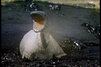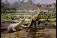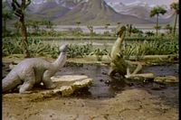 One of the dinosaurs is stuck in the tar pit.