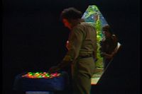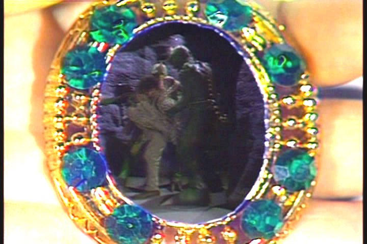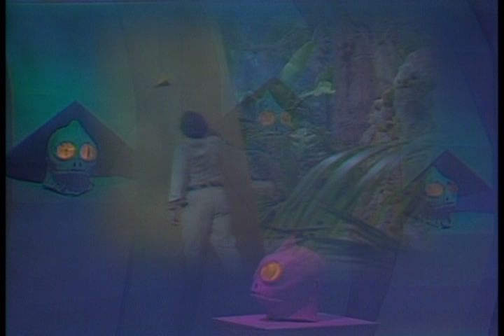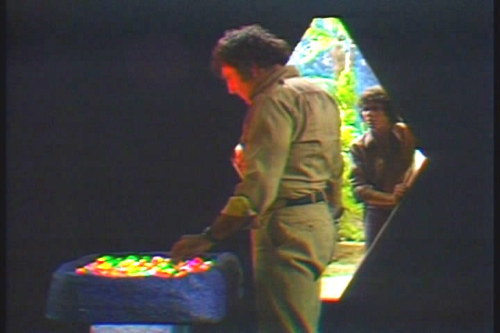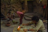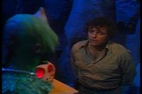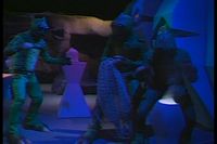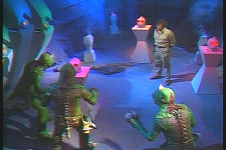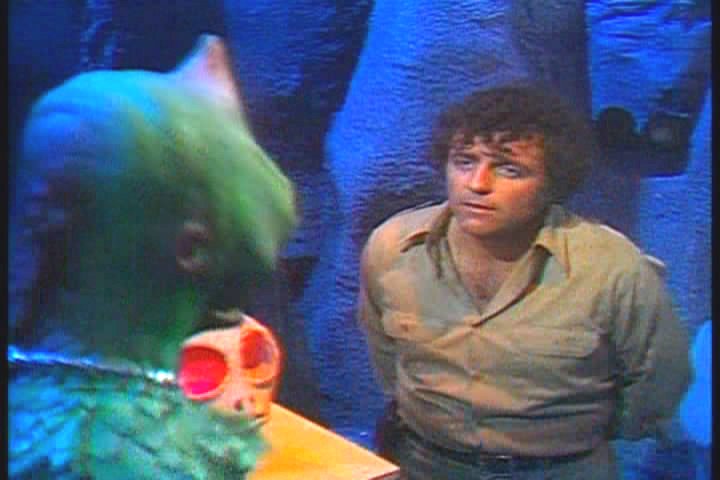 A Sleestak is talking to a skull. The Sleestak is wearing some kind of device that allows its voice to be heard in English.
