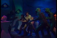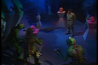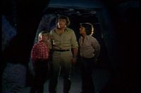 The sun sets. They run into some Sleestaks, but the Sleestaks don't bother them and return Rick's knife.