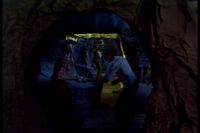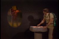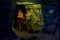 They find a crystal set in a metal structure. They're attacked by a Sleestak, but it's stopped by the bright light.