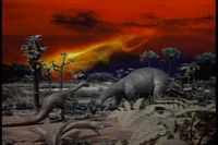 Dinosaurs to the left of them; dinosaurs to the right of them, so what do they do? Jump into the pond.
