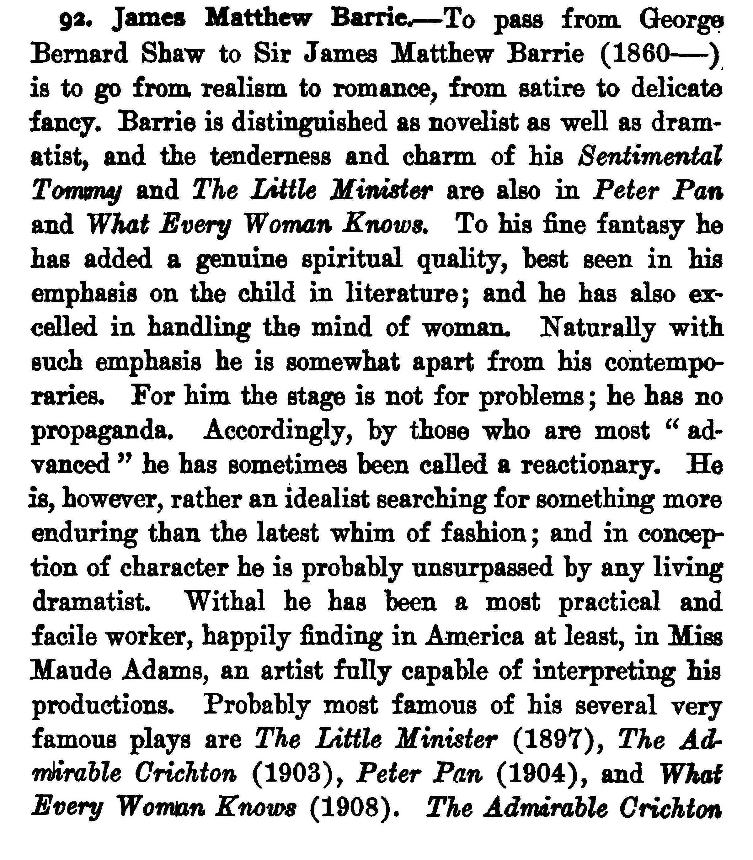 This has a short history of J.M. Barrie, and includes references to his plays that included Maude Adams. Note is says she was “..an artist fully capable of interpreting his productions.”