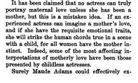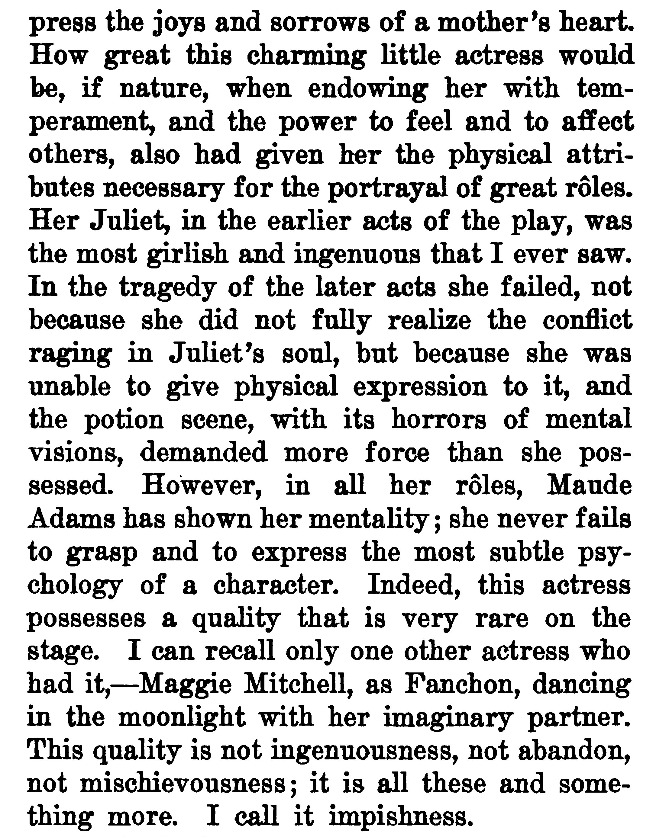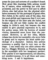 The author talks about Maude Adams, and notes that some of her trouble in dealing with the character of Juliet more due to Maude Adams physical build rather than any acting problems.