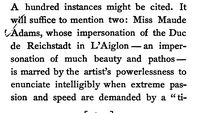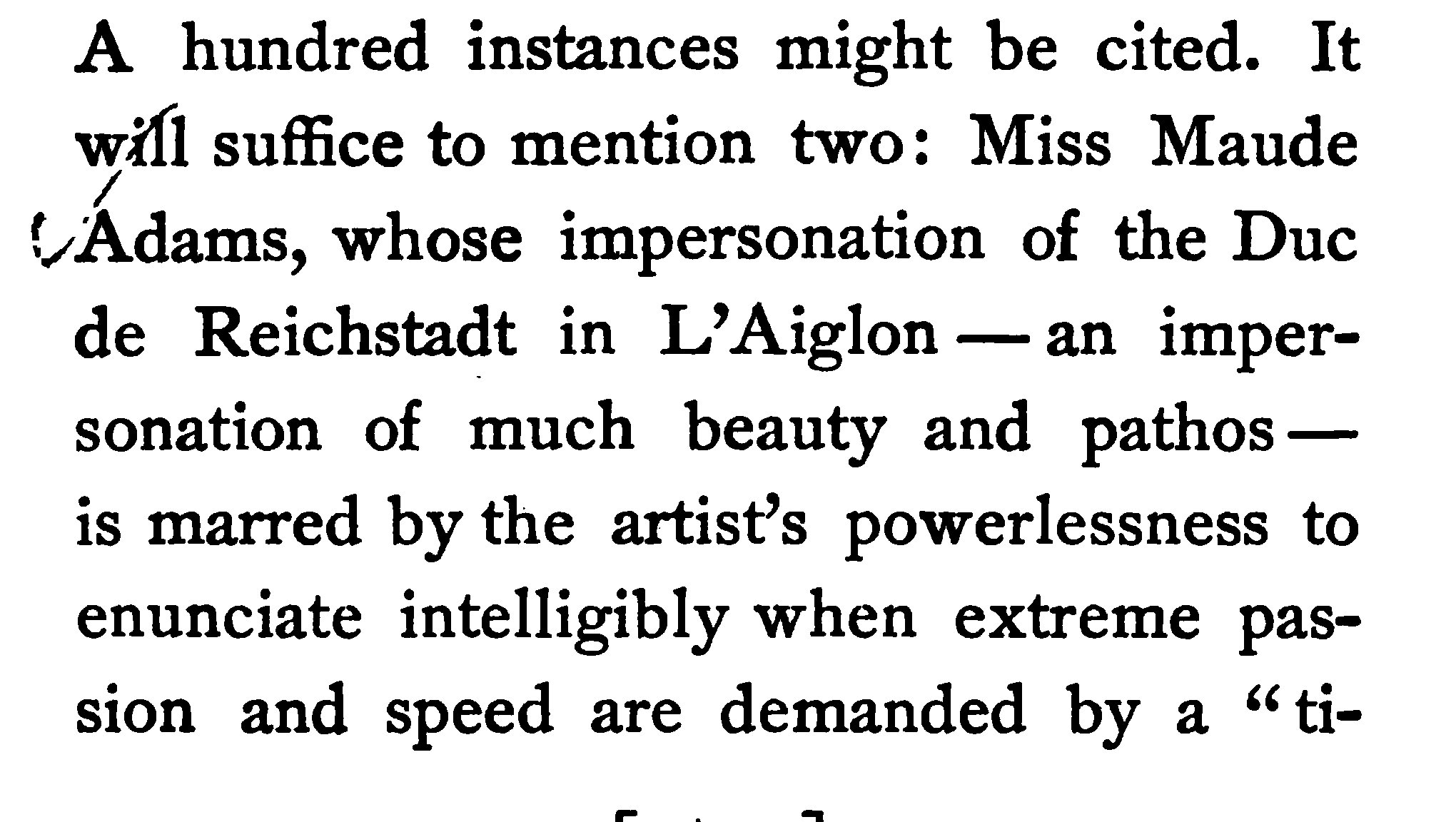 The author says that Maude Adams has trouble speaking the lines in L'Aiglon correctly.