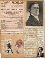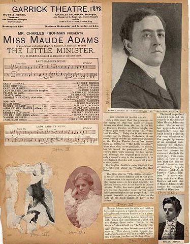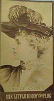 Adams, Maude (1872- ) American actress. Born in Salt Lake City where her mother was a leading woman in a stock company. her father, James Adams, was also an actor. She made her first stage appearance when but a baby and later appeared in child parts at the same time she attended school. Made a big success as Little Schneider in Fritz in 1877. At the age of 16, she joined E.H. Sothern's company in New York, laying an ingenue role in A Midnight Bell. She became a member of Charles Frohman's company and supported John Drew. Her most famous roles include Lady Babbie in The Little Minister, Juliet, the title role in Peter Pan,, Maggie Wylie in What Every Woman Knows,, and the principal parts in Men and Women, Quality Street, and A Kiss for Cinderella. After an absence of thirteen years from the stage (1918-1931) she merged from retirement to play the part of Portia in The Merchant of Venice, in which she toured during the season of 1931-1932. She toured the summer theatres as Maria in Twelfth Night in 1937.