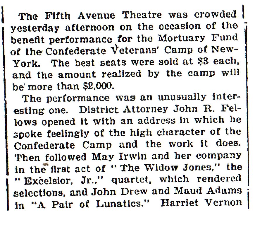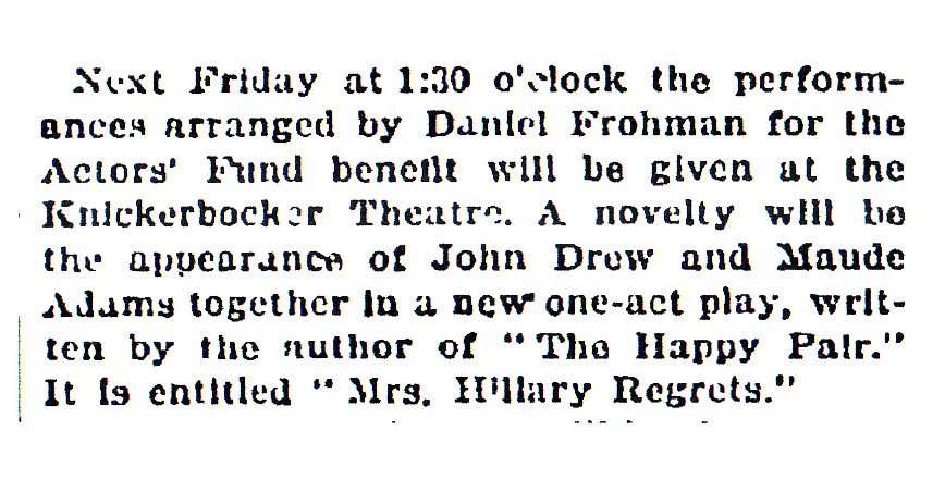 The above, taken from the New York Times of November 28, 1897, indicates that John Drew and Maude Adams are scheduled to appear in a play called Mrs. Hillary Regrets." Unfortunately, I haven't found anything else on such a play. Was it a one-off performance, or a planned play that, for some reason or another, never ended up actually being peformed?