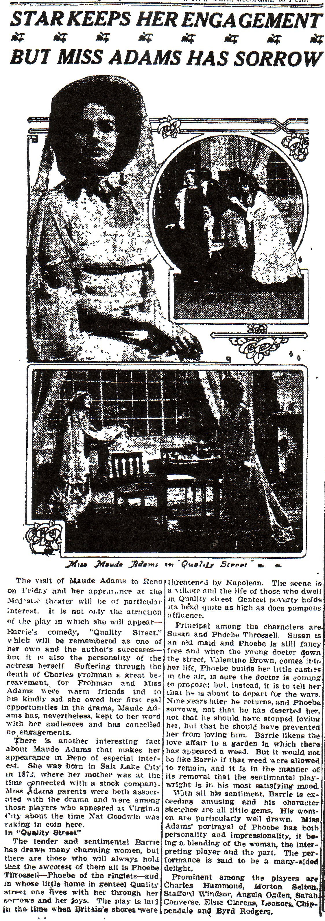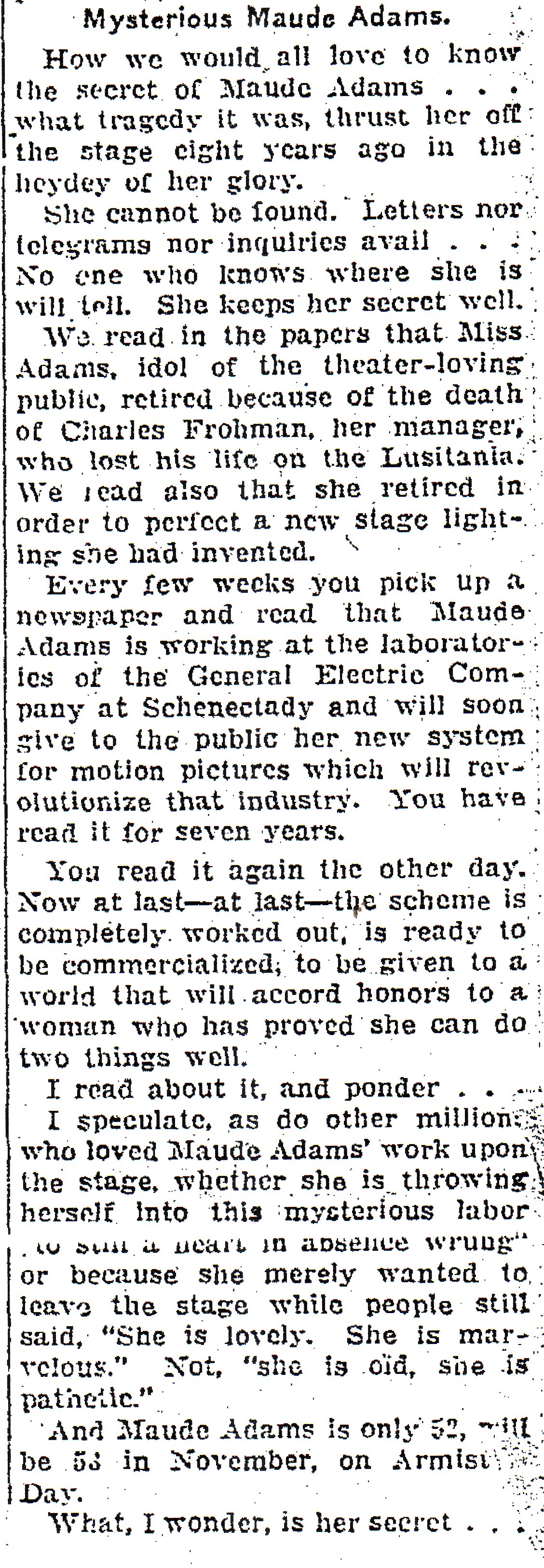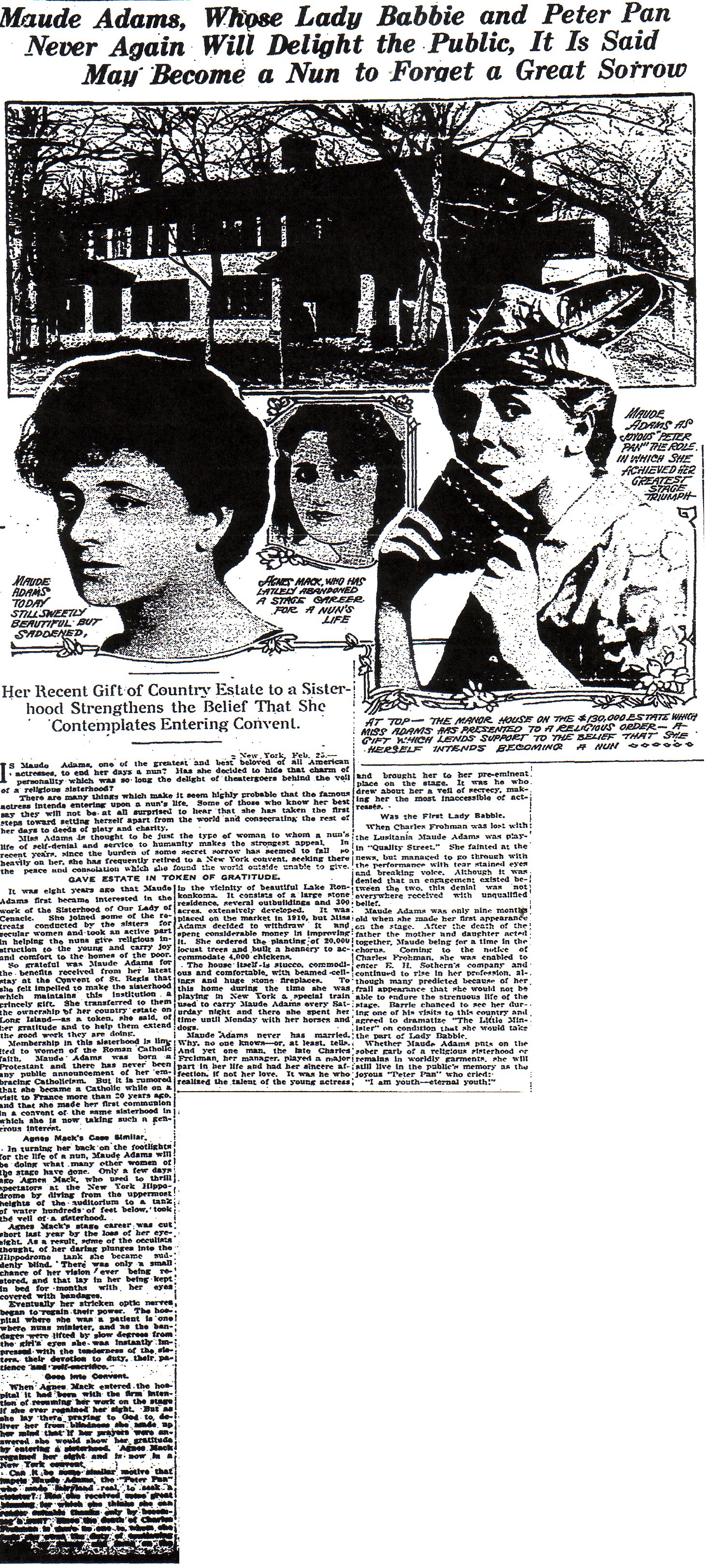 Then there are the articles that, even in their headlines, indicate some kind of sorrow or mystery for Maude Adams. These are three such articles, one of them even speculating that Maude Adams was planning to become a nun.