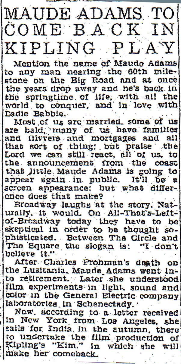 To add still another piece to the list of confusion, there's the movie called "Kim" which is referred to in this article from The Zanesville Signal of June 23, 1927, noting that Maude Adams would be going to India to do the film. This is the only reference I've found to such a thing being planned.