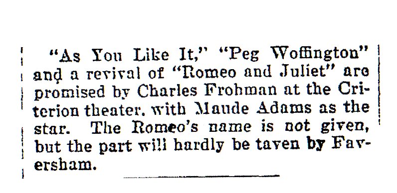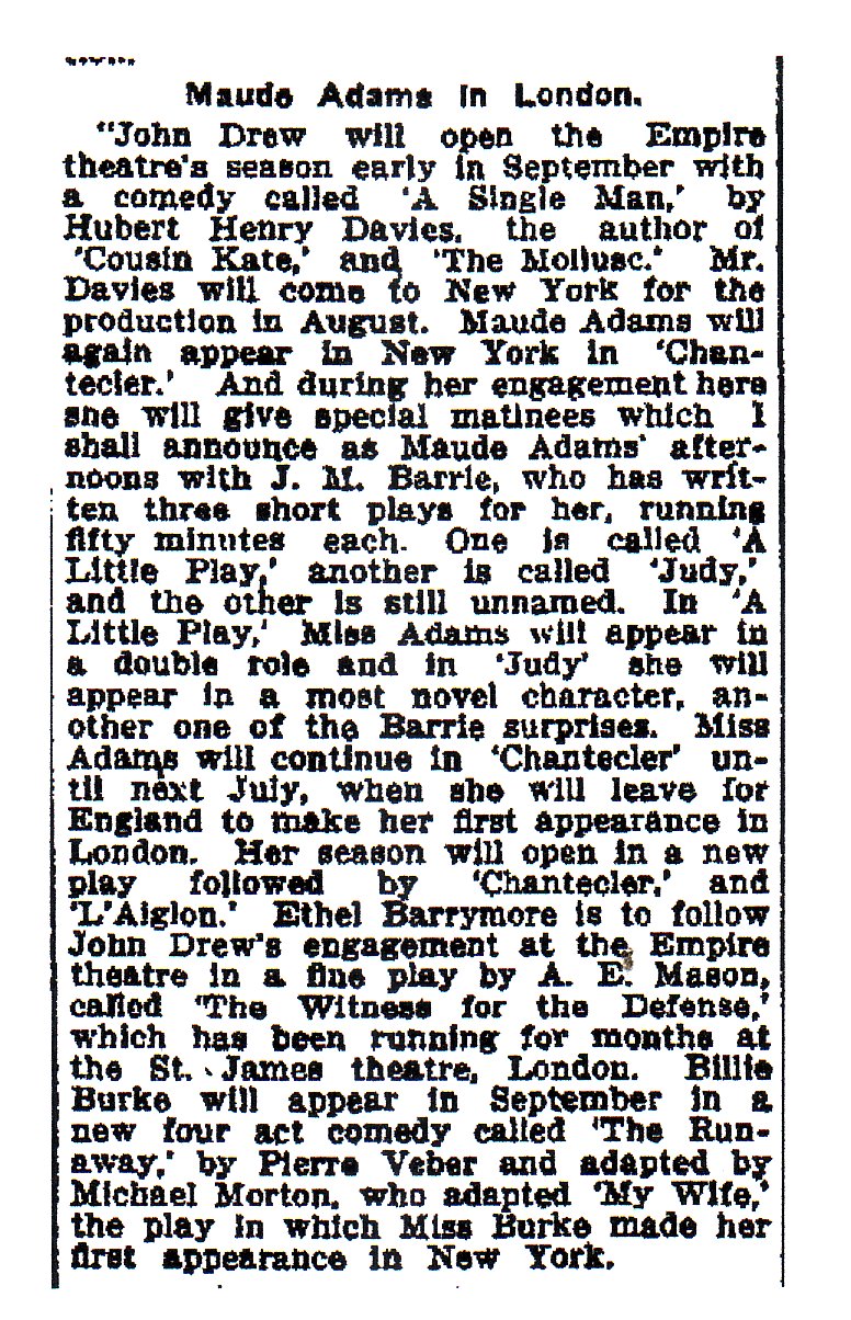 Reconstructing the past is not easy. If I had unlimited time and money and access to every file everywhere on Maude Adams I might be able to clear a few of these up, but unless the nearly impossible happens, these will remain confusions and minor mysteries, at least for me.