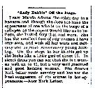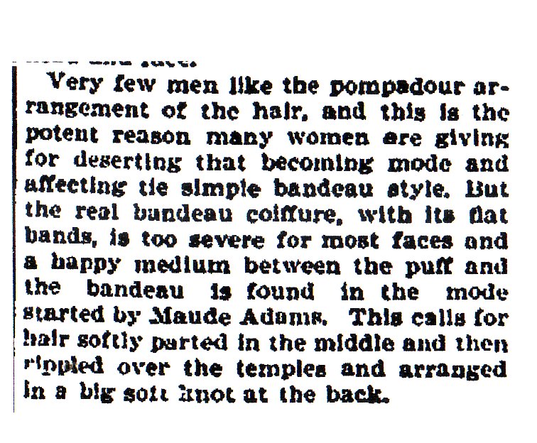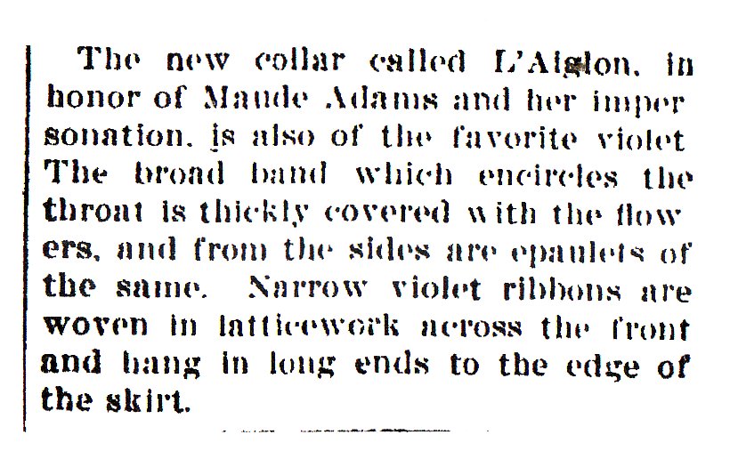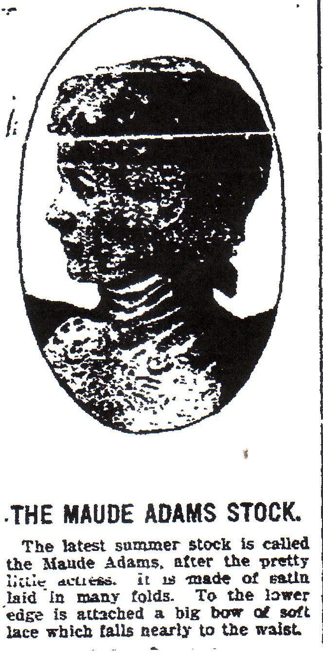 Row two, left, describes her hair style. The next one refers to "Maude Adams Hats". The next article describes the summer "stock" called the Maude Adams. Unfortuantely, I don't know what "stock" refers to, although from the context it could be a kind of dress. The final article refers to a "collar", an attachment at the top of a dress, named L'Aiglon, after Maude Adams in the play of the same name. Some decades later the "Peter Pan" collar became quite the thing for dresses for girls.