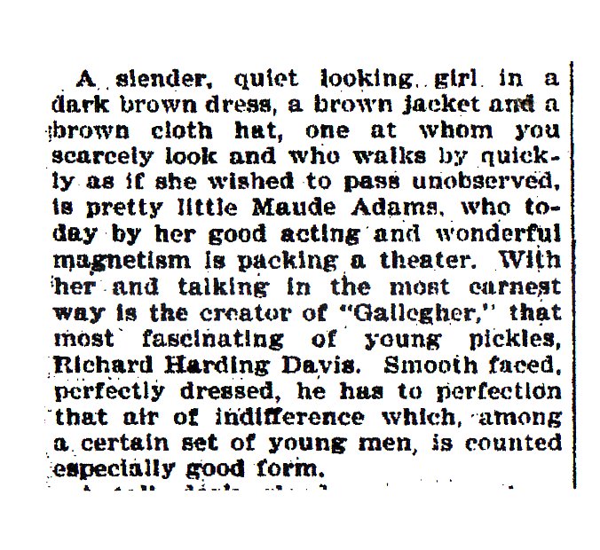 The top left article is about the type of gowns that she wore. The next article describes her clothes while she acts and notes that she looks like a "pretty schoolgirl" when seen on the street. The third article describes how she looks when on the street and, interestingly enough, her companion is Richard Harding Davis who was rumored to have been engaged to her. The fourth article is another about her general appearance, but makes allusion to rumors of just how thin she really is. THe final article in the top row describes her as "frail" and "girlish" in appearance.