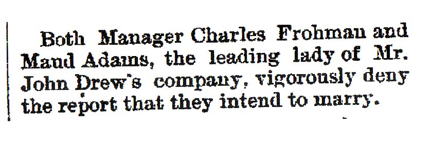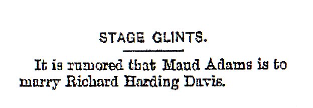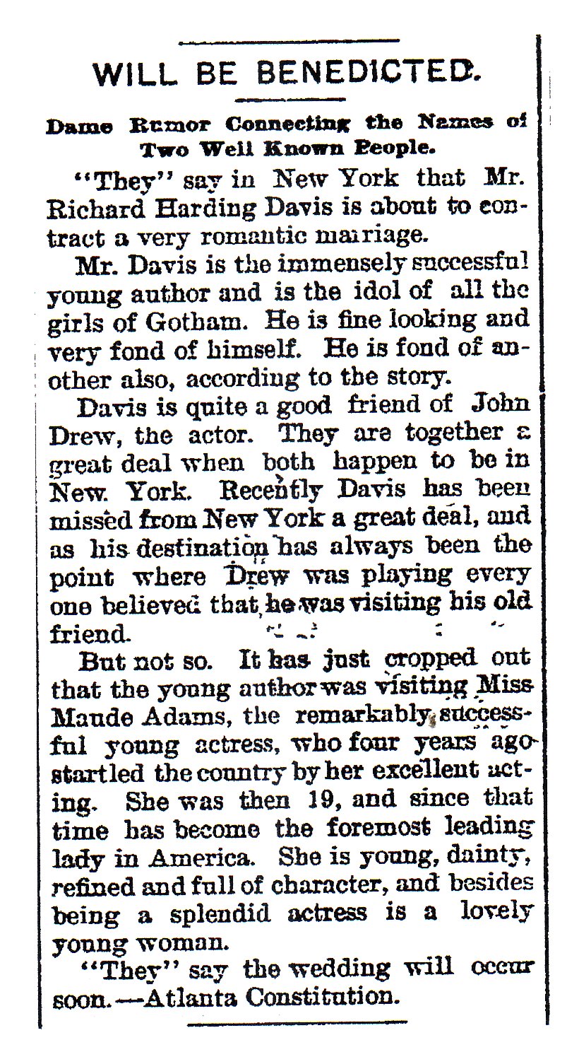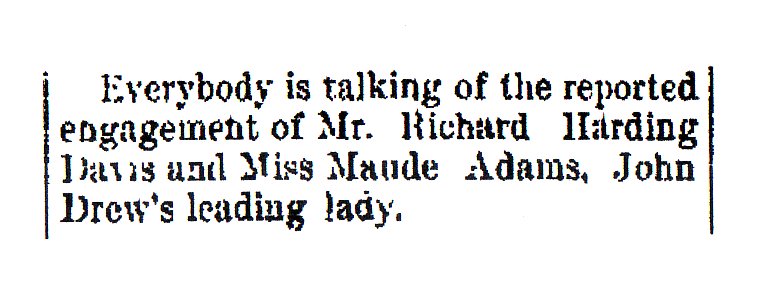 Just as in present-day tabloids, rumors about famous people were in the regular newspapers of the time. Maude Adams was linked to two different men; one not surprising, that being Charles Frohman. The second was someone named Richard Harding Davis.