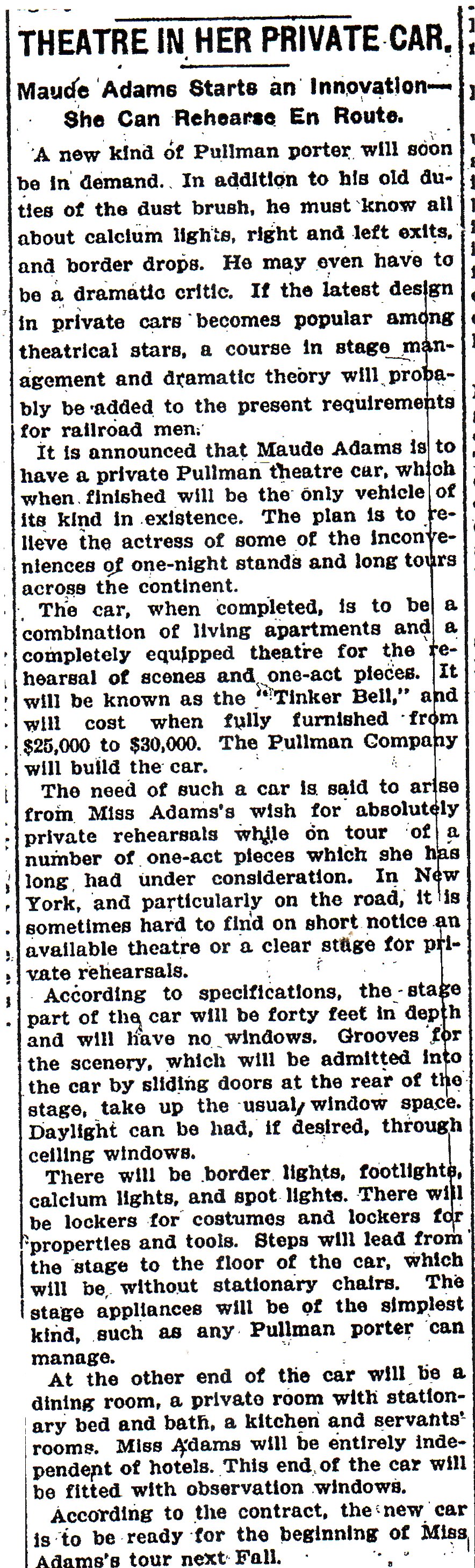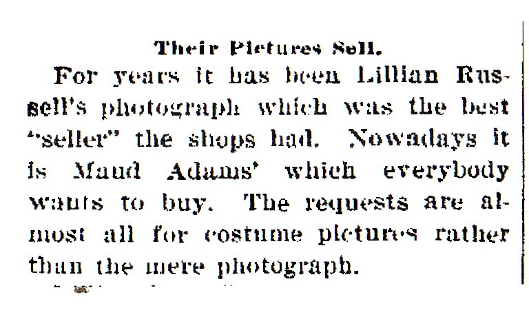 The first article refers to pictures of Maude Adams. (The closest thing to trading cards of the time were some tobacco cards that carried her picture.) The second article refers to posters of Maude Adams that were being sold.