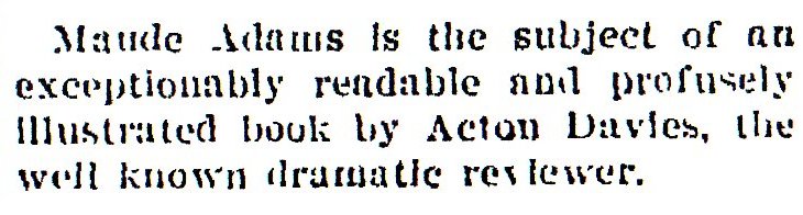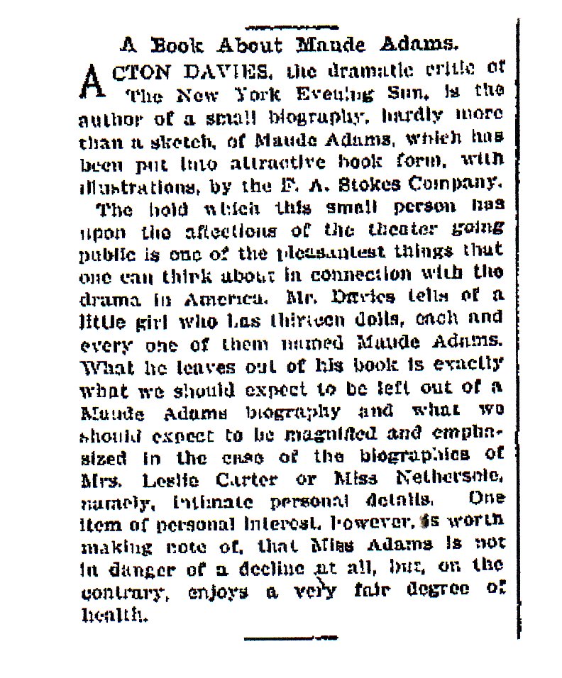This is a 1901 book about Maude Adams that is rather difficult to find. This part will only be the text; the pictures from the book are the separate play pages or in the misc. picture section.